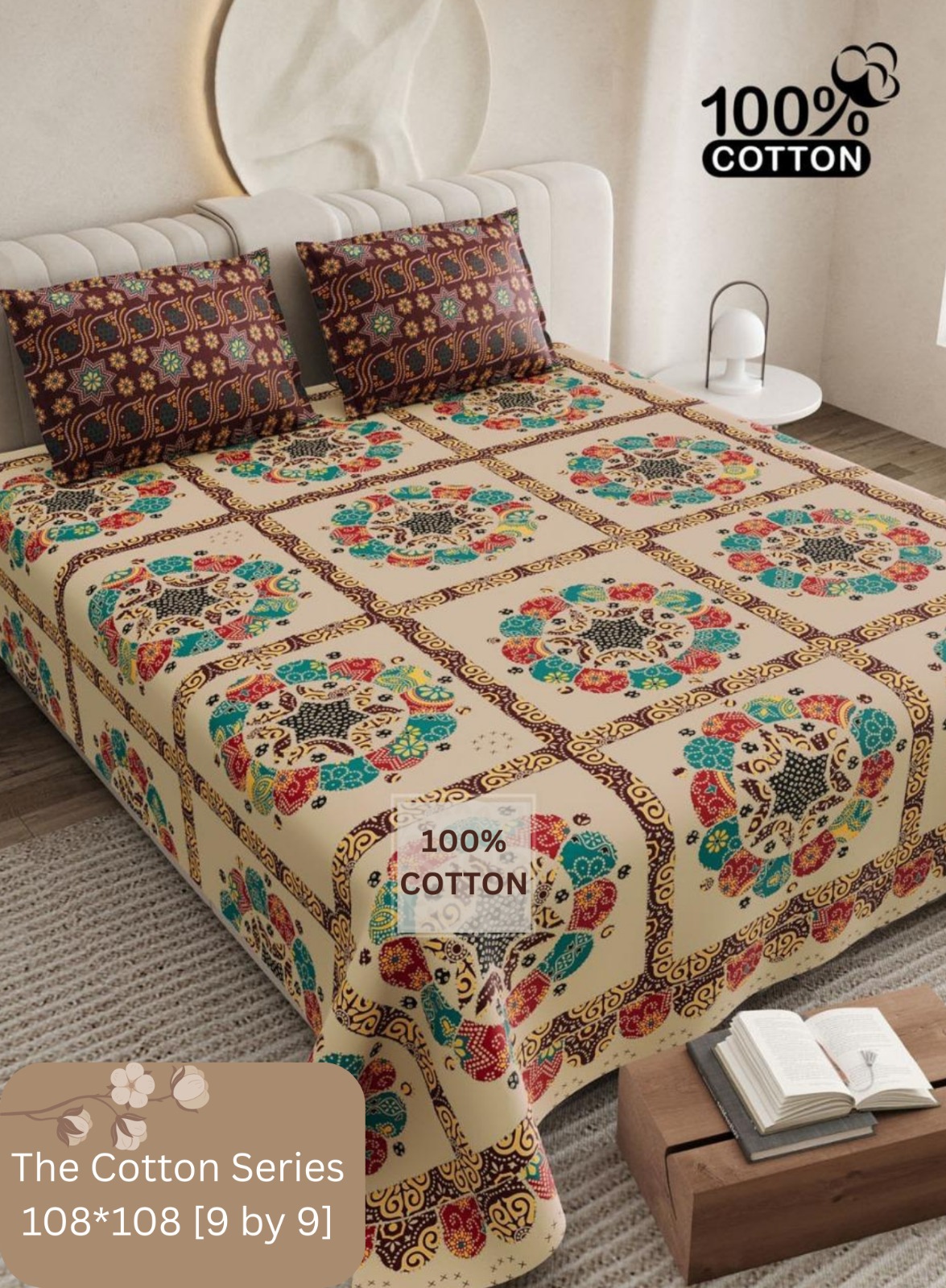 Crafted from 100% pure cotton, this king size bedsheet (108×108 inches) offers softness, breathability, and long-lasting comfort. The natural dyes and intricate motifs bring a timeless ethnic charm to your bedroom décor. The set also includes two matching pillow covers for a complete look.